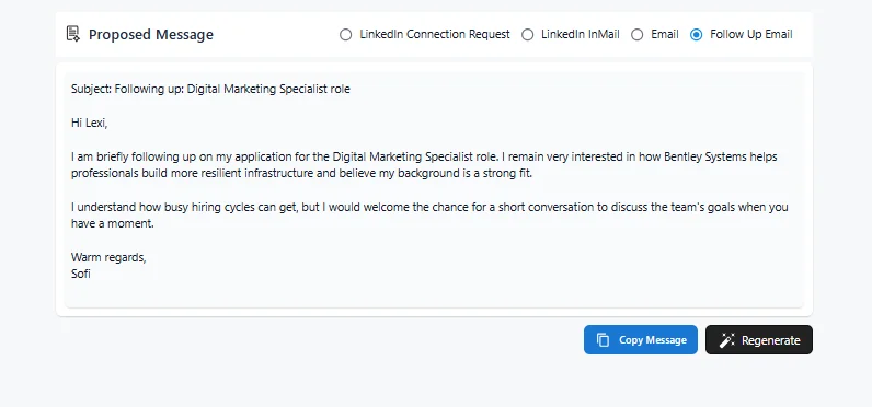 HirePilot solves this directly. When you apply for a role through the platform, it identifies the hiring manager behind the position and generates a personalized outreach message you can send immediately. You are not starting from a blank page or spending time on LinkedIn searching for the right contact. The message is ready. You review it, adjust anything that feels off, and send.